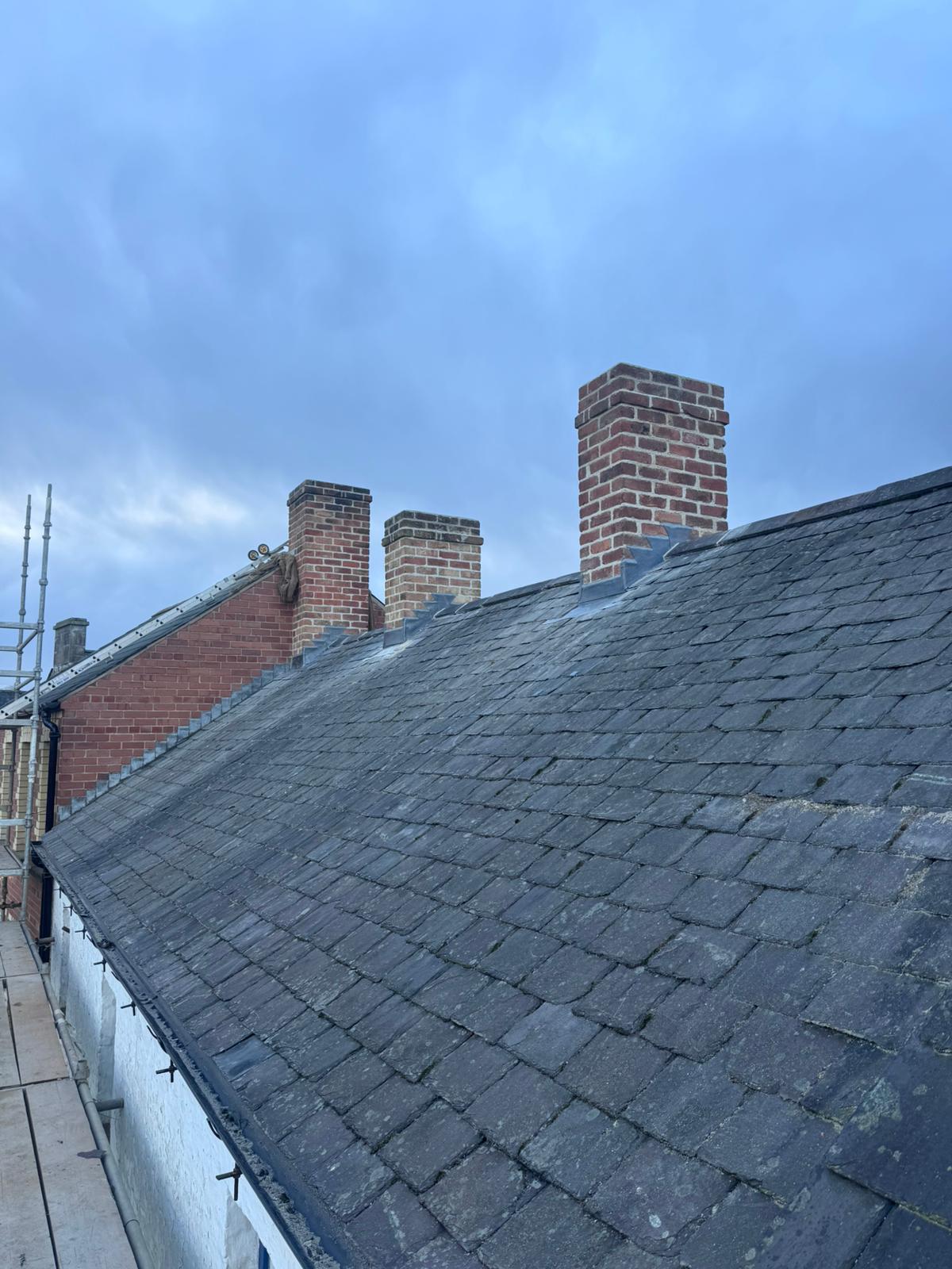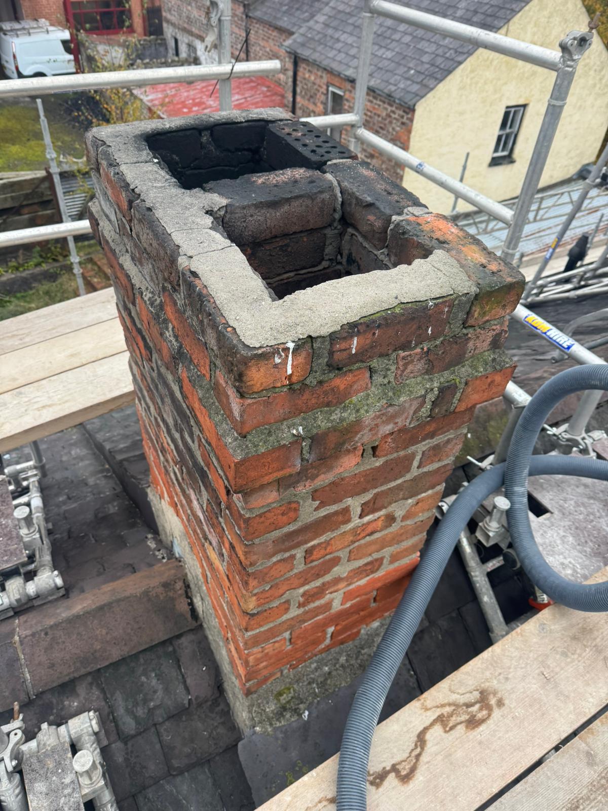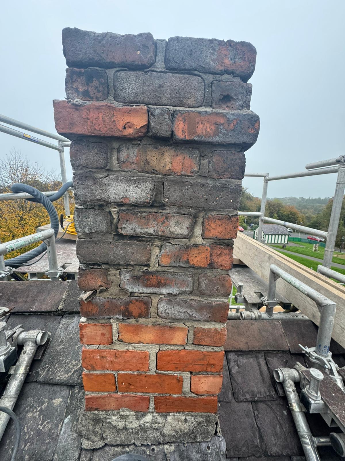 One chimney was found to be structurally unsafe and had to be carefully dismantled. It was then fully rebuilt using the original bricks, bedded and pointed in lime mortar to retain historic character and ensure appropriate movement and flexibility within the structure.