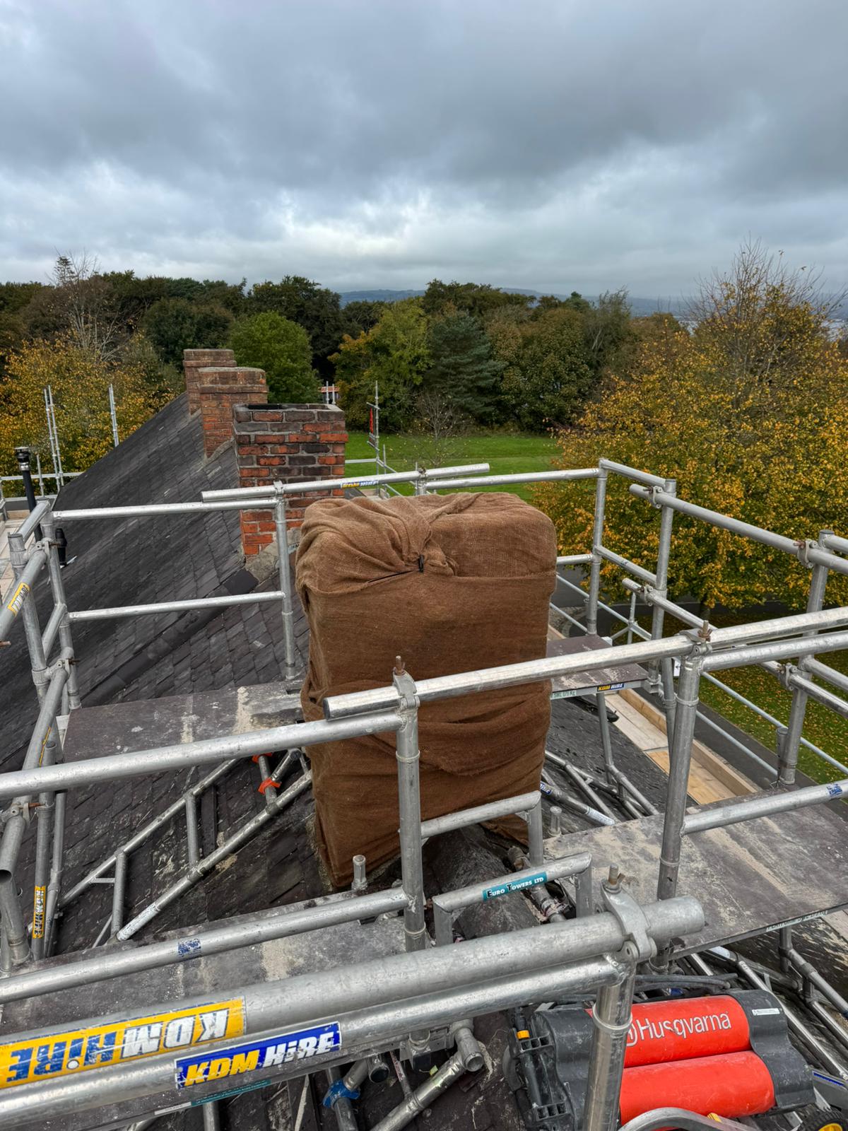 Following completion, the chimneys were wrapped in hessian for a controlled curing period. This traditional method protects fresh lime work from drying too quickly, allowing it to cure gradually and develop maximum strength.