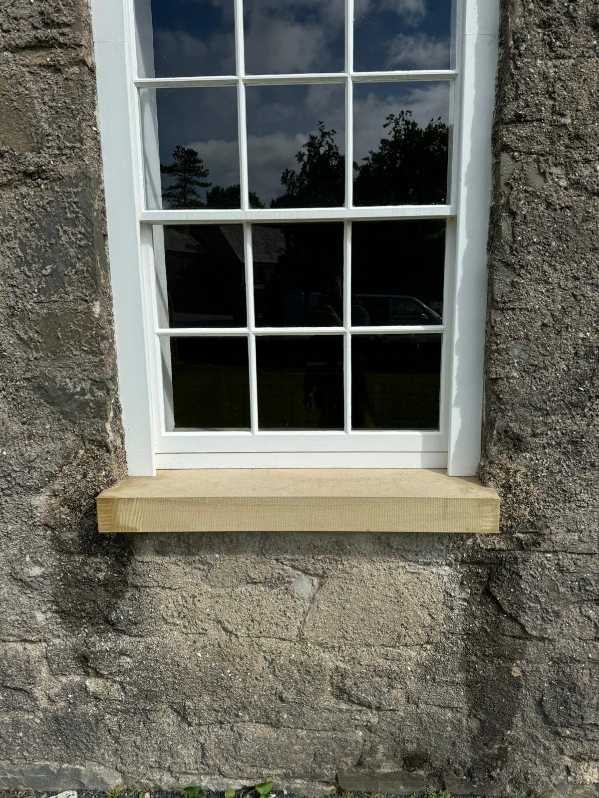 The replacement work focused on maintaining this historic integrity. The existing sandstone sills had deteriorated beyond repair, requiring full replacement rather than patching. Each new sill was individually shaped and finished by hand, ensuring accurate proportions, clean lines, and tooling marks consistent with traditional craftsmanship.